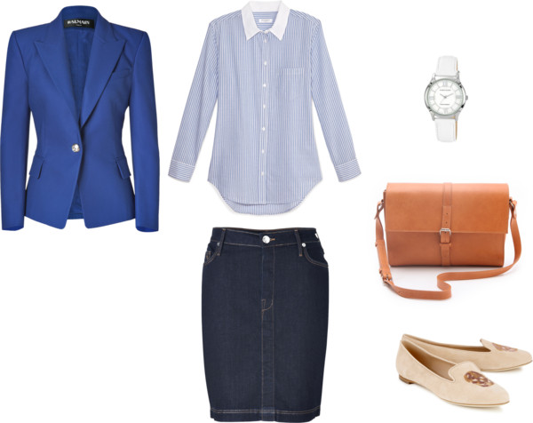 Equipment blue striped shirt / Balmain jacket / True Religion knee length pencil skirt / Alexander McQueen skull flat/ A.P.C. genuine leather handbag / Anne Klein water resistant watch