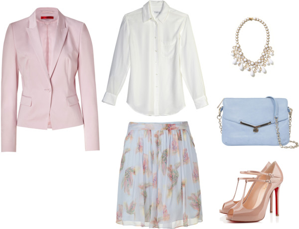 Equipment button up shirt / HUGO pastel blazer / Cacharel printed skirt / Christian Louboutin pumps / Banana Republic / Botkier Valentina Mini Convertible in Blue