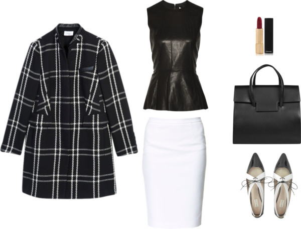 Skaist Taylor black peplum top / Zara white skirt / Marc Jacobs flat shoes / Maison Martin Margiela leather handbag/ Chanel lips makeup / Coat Holt Renfrew