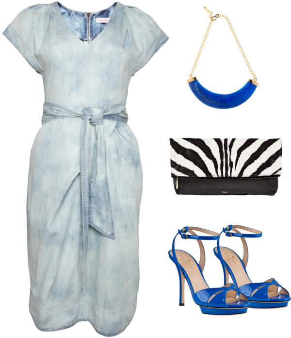 Rebecca Taylor blue dress/ Kate Spade high heel platform sandals / Emilio Pucci foldover handbag / Necklace Holt Renfrew
