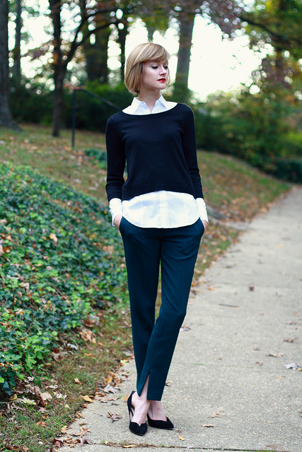 I’d work this: layered look – shrunken sweater, white button-down + cropped trousers and pointy toe flats